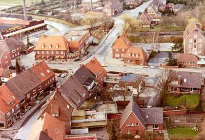 Aussicht vom Turm der St. Otger Kirche, auf den Kreuzungsbereich Hotel Tembrok/Berkelmühle. |